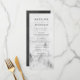 Cartão de cardápio personalizado elegante com uma floresta de pinheiros de cor d'água de cinza nebulosa no topo com seu nome, data de casamento e detalhes de menu mostrados abaixo. O menu reverte para um fundo de cor d'água de cinza de carvão com espaço para texto e fotos. Projetado para coordenar com a nossa coleção de casamento Elegante da Floresta de inverno.