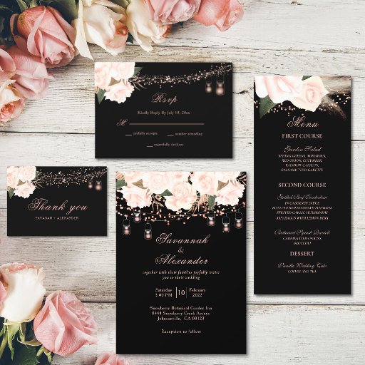 Menu de Casamento Floral do Elegante Black & Blush Rosa.