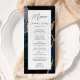 Este elegante e moderno menu de casamento mostra um marinho azul de aquarela com o fundo de agata aparado com brilho dourado. O texto aparece na escrita elegante de cinzas de carvão vegetal e sans serif fonts em um retângulo branco. O design de ágata é repetido no reverso.