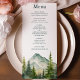 Tratem seus convidados a uma jornada culinária no meio da beleza da natureza com nosso Menu Rustic Mountain Forest Evergreen Tree Wedding. Projetado para complementar o charme rústico de um casamento de floresta de montanha, este cartão de menu mostra suas ofertas deliciosas enquanto captura a essência da elegância natural. Apresente o seu cardápio de casamento contra o pano de fundo da beleza da natureza com o nosso design cênico. Cada cardápio apresenta uma imagem cativante de montanhas majestosas e árvores cada vez verdes, evocando um senso de tranquilidade e romance rústico. Deixem os vossos hóspedes banquete os olhos no cenário de tirar o fôlego à medida que antecipam as delícias culinárias a chegar. Aprecie os paladares dos seus convidados com uma seleção curada de sabores rústicos e ingredientes sazonais. De louças inspiradas na montanha a delicadezas elegantes inspiradas na floresta, o nosso menu oferece algo para satisfazer todo o gosto e preferência. Elevem sua experiência de jantar com a recompensa natural das montanhas. Tratem seus hóspedes a uma jornada culinária em meio à beleza da natureza com o nosso Menu de Casamento de Árvores Evergreen Forest. Com designs cênicos e ofertas elegantes, personalize sua apresentação culinária para uma celebração memorável de elegância rústica. Explore nossas opções de menus e encare seus convidados hoje!
