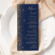A borda esquerda deste elegante cardápio moderno de casamento apresenta um design de brilho dourado. O texto personalizável combina uma letra pálida de cor dourada, uma letra copperplate e uma letra itálico num fundo azul marinho. O verso apresenta um design brilhante marinho azul e dourado.