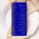 A borda esquerda deste elegante cardápio moderno de casamento apresenta um design de brilho dourado. O texto personalizável combina uma letra pálida de cor dourada, uma letra copperplate e uma letra itálico num fundo azul real. O verso apresenta um design de brilho azul real correspondente e ouro.