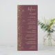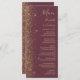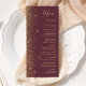 A borda esquerda deste elegante cardápio moderno de casamento apresenta um design de brilho dourado. O texto personalizável combina manuscrito pálido de cor dourada, fontes copperplate e itálico em um fundo burgundy escuro. O verso apresenta um design de burgundy e dourado.