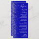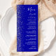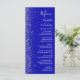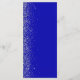 A borda esquerda deste elegante cardápio moderno de casamento apresenta um design de cintilação. O texto personalizável combina manuscrito branco, fontes em copperplate e itálico em um fundo azul real. O verso apresenta um design brilhante real e prateado.