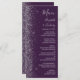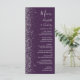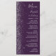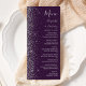 A borda esquerda deste elegante cardápio moderno de casamento apresenta um design de cintilação. O texto personalizável combina a escrita manual de cinzas prateadas, fontes copperplate e itálico em um fundo roxo escuro. O verso apresenta um design de brilho roxo e prateado correspondente.