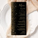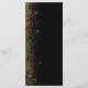 A borda esquerda deste elegante cardápio moderno de casamento apresenta um design de brilho dourado. O texto personalizável combina manuscrito colorido de ouro pálido, fontes copperplate e itálico em um fundo preto. O verso apresenta um design de brilho preto e dourado correspondente.