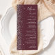A borda esquerda deste elegante cardápio moderno de casamento apresenta um design de cintilação. O texto personalizável combina a escrita manual de cinzas prateadas, fontes em copperplate e itálico em um fundo burgundy. O lado inverso apresenta um design de burgundy e brilho prateado.