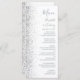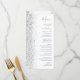 A borda esquerda deste elegante cardápio moderno de casamento apresenta um design de cintilação. O texto personalizável combina a escrita manual de cinzas, as fontes em copperplate e itálico em um fundo branco. O verso apresenta um design de brilho branco e prateado.