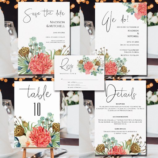Este lindo Invitation Suite de Casamento Contém um buquê floral de cor d'água em rosa, marfim, verde e azul. Elementos botânicos Palmas, vagens de sementes, verduras secas, flores, eucalipto e verde. Perfeito para um casamento moderno boho, esta suíte inclui um buquê floral, cores brilhantes e um simples design moderno.