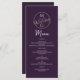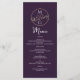 Menu de casamento simples, moderno, minimalista, elegante e roxo escuro com monograma gigante - iniciais no topo, desenhadas à mão de aves de casal de ouro e roteiro de caligrafia.
