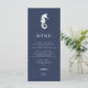 Esta elegante suíte de náutica apresenta estilo náutico clássico com um olhar limpo e minimalista. Ondas estilísticas em tons de aqua a azul marinho e uma bela ilustração do cavalo marinho fornecem sotaques únicos. Uma pequena imagem de cavalo marinho em branco, em azul marinho, juntamente com uma modelo para adicionar as seleções de menu, as iniciais e a data do casamento. Perfeito para casamentos de iates, barco, praia ou destino de verão. Procure ID836 para ver este conjunto completo e outros que oferecem sotaques de elementos marinhos alternativos.