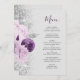 Este elegante cardápio moderno de casamento apresenta um design floral roxo e lavanda, aparado com falso brilho prateado. O texto personalizável combina o script de escrita manual roxo e a fonte da placa de reprodução da cinza de carvão em um fundo de cinza pálido. O verso repete o design floral.
