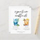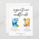 Esta folha de menus de coquetéis de assinatura tropical apresenta uma simples tipografia negra acima de 2 bebidas e seus ingredientes para seu bar de casamento. Um belo desenho de Lagoa Azul e Mai Tai adiciona um talento legal ao seu menu de bar. Preencha com os nomes dos casais e a data para sua recepção.