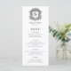 Este elegante menu de casamento preto e branco apresenta uma crista de vintage ornamentado moldando as iniciais do monograma do script interligado da noiva e do noivo na fonte do roteiro formal do rico. Encontre produtos correspondentes na coleção, ou envie-me mensagens através do Zazzle Chat para obter mais produtos e ajustes de design.