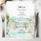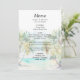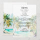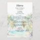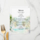 Este elegante e belo cardápio de casamentos de aquarelas mostra uma praia, céu azul e palmeiras. O texto combina o script manuscrito e as fontes sans serif para uma aparência na moda e moderna. Isto é perfeito para uma praia de verão ou um casamento de destino tropical.