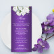 Este belo cardápio de casamento tem um design elegante e sofisticado que dá o tom para o seu dia especial. A cor roxa arrojada e atraente do cardápio seguramente atrai a atenção de seus convidados, enquanto as rosas brancas no topo adicionam um toque de elegância e romance. O texto branco simples facilita a leitura do menu e complementa o design geral. Este cardápio é perfeito para casais que querem criar um casamento memorável e na moda com uma atmosfera bonita e romântica. Além disso, este menu é altamente personalizável e pode ser adaptado para incluir detalhes pessoais do menu de casamento para a recepção. Independentemente de como você escolher personalizá-lo, este maravilhoso menu de casamento roxo com rosas brancas será uma bela e memorável adição ao seu dia especial.