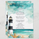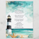 Belo cardápio de casamento com um farol preto e branco náutico, peixe-estrela e conchas. Perfeito para um casamento. As palavras podem ser alteradas para se adequarem aos seus próprios detalhes ou requisitos