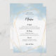 Cartões de menus para as suas mesas de casamento com um design elegante que inclui um quadro geométrico dourado e uma tipografia negra clássica. Uma lavagem de aquarela azul-clara corre ao longo de cima e de baixo, levando a uma área de fundo branca no meio, e a mesma aquarela cobrir parcialmente o reverso dentro de um padrão geométrico dourado. O texto é facilmente personalizado e a cor do texto pode ser alterada se você desejar, por meio da opção Clique para Personalizar mais.
