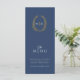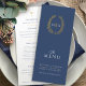 Janto de casamento azul-escuro, branco e dourado. Edite este menu de 4 cursos com o seu próprio texto de opção de refeição. Folhas ovais e design de monograma desenhadas à mão modernas, mas clássicas. © Original desenho de mão oval e design por Sarah Trett para www.mylittleedenweddings.com exclusivamente em zazzle.