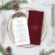 Estes elegantes cartões de cardápio de inverno apresentam um buquê temático de Natal no topo com verde-aquarela, cones de pínus e galhos verdes de inverno, acentuados com groselhas vermelhas e arborizadas. Na parte de trás está uma textura de cor d'água burgundy, com os nomes da noiva e noiva e a data do casamento. Encontre o resto do pacote de convites de casamento e mais produtos correspondentes na coleção, ou envie-me mensagem através do Zazzle Chat se precisar de ajustes de design ou mais produtos correspondentes.