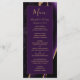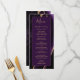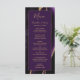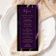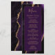 Este elegante e moderno menu de casamento mostra uma cor d'água roxa de fundo arredondada com brilho dourado. O texto aparece em letras elegantes douradas coloridas e fontes em placas em um retângulo de ameixa rico. O design de ágata é repetido no reverso.