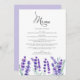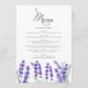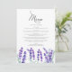 Adicione um sotaque floral elegante à capa de sopa do seu evento com estes cartões de menu de lavanda. Apresenta ilustrações de aquarela de flores lavandas. Personalize adicionando nomes e detalhes do menu. Estes cartões florais de lavanda são perfeitos para casamentos de primavera. chás de panela, chás de fraldas, aniversários e festas semelhantes.
