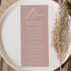 Menu de casamento simples e elegante com "Menu" exibido em um roteiro branco moderno com um fundo rosa empoeirado ou cor de sua escolha. Personalize o menu de casamento empoeirado por rosa, adicionando seus nomes, data de casamento e informações do menu. Projetado para coordenar com a nossa coleção de casamento do Modern Elegance.