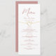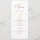 Este menu de casamento minimalista apresenta uma caligrafia moderna e empoeirada de rosa, emparelhada com sans serif text elegante e um motif romântico de corda de ouro. Projetado em um layout vertical elegante, ele inclui uma divisão de curso de cheio de iniciadores para sobremesas, tudo personalizável para refletir o menu de janto especial. Perfeito para recepções de casamento modernas, elegantes ou românticas, este design complementa configurações sofisticadas de mesa e combina com outros artigos de papelaria de casamento em ouro rosa.