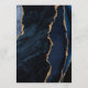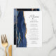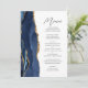 Este elegante cardápio moderno de casamento apresenta uma marinho azul de aquarela agata bordada com falso brilho dourado. O texto personalizável combina o script de escrita manual de cinzas de carvão e as fontes sans serif em um fundo branco. O design de agate azul e dourado do marinho é repetido no verso.