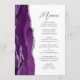 Este elegante cardápio moderno de casamento apresenta uma cor d'água púrpura e borda agitada com falso brilho prateado. O texto personalizável combina o script de escrita manual de cinzas de carvão e as fontes sans serif em um fundo branco. O design de agato roxo e prateado é repetido no verso.