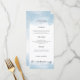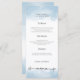 O título principal Menu corre ao longo da borda inferior e está em um roteiro romântico moderno com batidas cardíacas. O resto do texto é facilmente personalizado para você alterá-lo para o seu próprio menu. Um pano de fundo azul-claro-claro-d'água corre ao longo das bordas superior e inferior e também preenche parcialmente o verso, levando a um fundo branco.