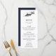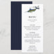 Espadim de água do chic costeiro, cartão de menu náutico. Modelo oferece espaço para nomes, data e três títulos de menu com descrições. A cor de backup mostrada em azul escuro de marinho pode ser personalizada.