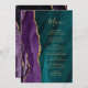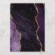 A borda esquerda deste elegante cardápio moderno de casamento apresenta uma cor d'água roxa, borda agitada com falso brilho dourado. O texto personalizável combina o script de escrita manual dourada e as fontes em uma cor d'água de fundo agate. O verso apresenta um design de agate roxo e dourado correspondente.