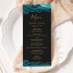 Este elegante e moderno menu de casamento apresenta bordas de cima e de baixo da cor azul lacrimejada, cortada com brilho dourado. O texto aparece em letras elegantes douradas, letras itálicas e em placas em fundo preto ardente. O design de ágata é repetido no reverso.