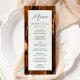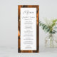 Este elegante e moderno menu de casamento mostra uma cor-de-água queimada, cor de laranja, e o fundo cortado com brilho dourado. O texto aparece na escrita elegante de cinzas de carvão vegetal e sans serif fonts em um retângulo branco. O design de ágata é repetido no reverso.