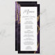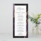 Este elegante e moderno menu de casamento mostra uma cor d'água roxa de fundo arredondada com brilho dourado. O texto aparece na escrita elegante de cinzas de carvão vegetal e sans serif fonts em um retângulo branco. O design de ágata é repetido no reverso.