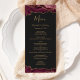 Este elegante e moderno menu de casamento apresenta bordas de cima e de baixo da cor d'água burgundy, cortada com brilho dourado. O texto aparece em letras elegantes douradas, letras itálicas e em placas em fundo preto ardente. O design de ágata é repetido no reverso.
