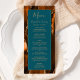 Este elegante e moderno menu de casamento mostra uma cor-de-água queimada, cor de laranja, e o fundo cortado com brilho dourado. O texto aparece em letras elegantes douradas e fontes em cores em um retângulo azul teal. O design de ágata é repetido no reverso.