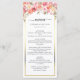 Este elegante menu de casamento mostra buquês florais de aquarela em tons de pêssego e rosa. O texto elegante está rodeado por uma moldura dourada. Fácil de personalizar clicando em "Personalizar".