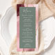 Este elegante e moderno menu de casamento mostra uma cor d'água cor rosa pincelada, aparada com brilho dourado. O texto é exibido em letras elegantes e claras e com letras em cores em um retângulo verde profundo. O design de ágata é repetido no reverso.