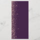 A borda esquerda deste elegante cardápio moderno de casamento apresenta um rosa dourado faux glitter design. O texto personalizável combina letras rosa pálidas, letras em copperplate e fontes itálicas em um fundo roxo escuro. O lado inverso apresenta um design brilhante de púrpura escura e rosa.