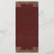 Este elegante cardápio de casamento burgundy com ar vintage, recomendado para um casamento mais formal, de "gravata negra", tem, em ambos os lados, decorações barrocas ouros nas bordas superior e inferior, sobre um fundo vermelho arrojado. O título "Menu" e as legendas são escritos num script caligráfico. Todo texto pode ser personalizado e tem uma cor de ouro semelhante às bordas do ouro. As elegantes decorações de ouro em vermelho burgundy são de um vintage cobrir de livro francês que se liga a partir do final do século 19, agora em dominio público, de Nicolas Denis Derome (1731-1790), conhecido como Derome le Jeune, para um livro intitulado "Gaspar Pergam Epistol".