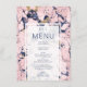 Este elegante e moderno menu de casamento apresenta um fundo azul marinho, azul esbranquiçado e mármore dourado. O texto aparece em uma fonte simples e moderna de sans serif azul-marinho em um retângulo semitransparente branco alinhado com a parte inferior da placa. A parte traseira do menu é azul marinho sólido.