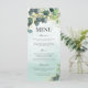 Cartões de cardápio elegantes com uma aquarela rustica esmaecida lavada em fundo, folhas botânicas de eucalipto, pedaços de folha de ouro falsa e um modelo de opção de menu simples.