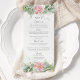Lindos cartões de cardápio de casamento com cor d'água floral rosa eucalipto e folhas de ouro. Escolha perfeita para primavera e casamentos de verão.