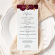 Este elegante cardápio moderno de casamento mostra uma borda de flores burgundy e folhas de folhas falsas de ouro. O texto aparece no script de escrita manual de cinzas de carvão e sans serif fonts em um fundo branco.