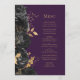 Este elegante cardápio moderno de casamento mostra uma borda de flores pretas e folhas de folhas falsas douradas. Personalize o texto em itálico dourado em um fundo roxo escuro. A parte de trás do menu é roxa sólida.
