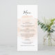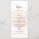 Este design apresenta um salto de elegante cor d'água de pêssego. Esse simples design tira proveito do traçado natural do pincel de abertura de aquarela para enfatizar o texto. A data do casamento está marcada em preto e branco. A combinação da cor de pêssego com as cores preto e branco cria um estilo sofisticado, moderno e chic. Design de cardápio de casamento elegante com elementos modernos. A configuração moderna da tipografia lhe dá um estilo distinto. Os convites de casamento e outros artigos de papelaria também estão disponíveis.