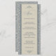 Um elegante modelo de cardápio de casamento em azul e beige damask com um padrão bege sutil de riscas contendo o texto do cardápio. Você pode reposicionar os gráficos nesta placa de menu arrastando-os para o local desejado.