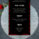 Apresentando o menu de casamento elegante preto e vermelho floral escuro - a maneira perfeita de dar o tom para o seu grande dia. Apresentando um design floral preto e vermelho impressionante, esse convite exude sofisticação e elegância, com um toque de talento gótico. O intrincado padrão floral adiciona um toque de romance, fazer-o a escolha perfeita para um elegante e único casamento não tradicional. Este cartão de cardápio do casamento contém a lista de pratos, nomes de seus casais, data do casamento, etc.
